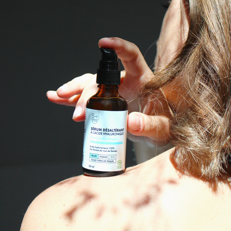 - Le Sérum désaltérant à l'acide hyaluronique : hydrate intensément, repulpe et redonne de l’élasticité à la peau.