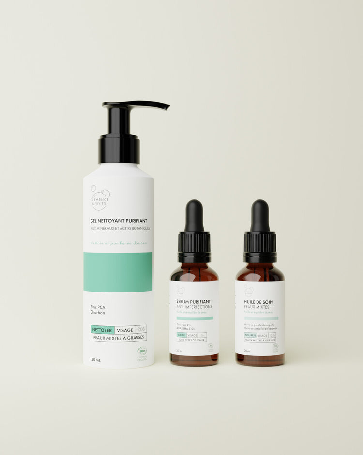 Nettoyez votre peau avec le Gel nettoyant purifiant pour éliminer toutes les impuretés. Ensuite, appliquez le Sérum anti-imperfections pour hydrater et traiter les imperfections, tâches, acnés... Puis complétez avec l'Huile de soin peaux mixtes pour nourrir en profondeur tout en régulant votre sébum.