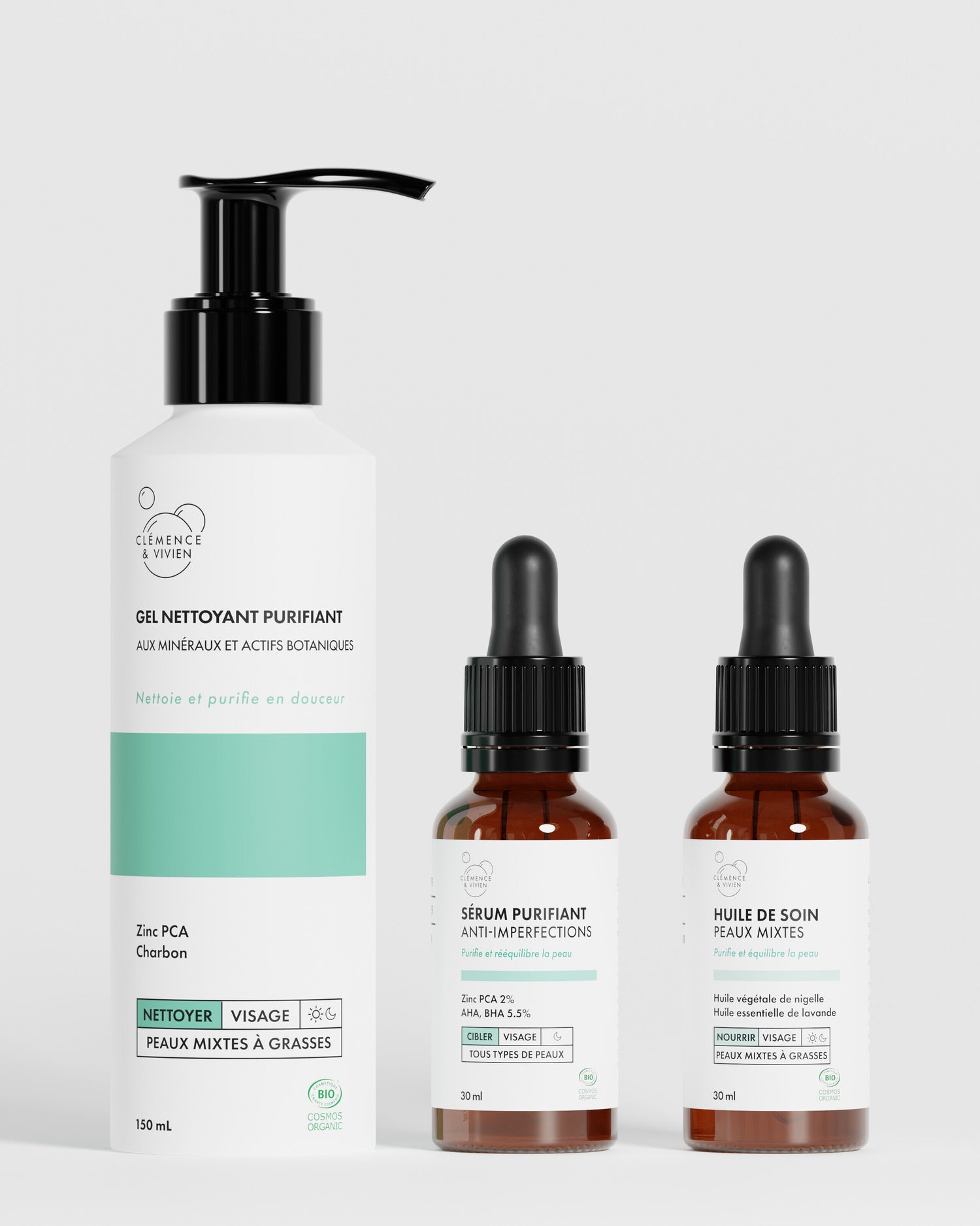Un trio purifiant anti-imperfections avec le Gel nettoyant purifiant, le Sérum purifiant et l'Huile de soin peaux mixtes pour une peau exfoliée, équilibrée, apaisée et purifiée.