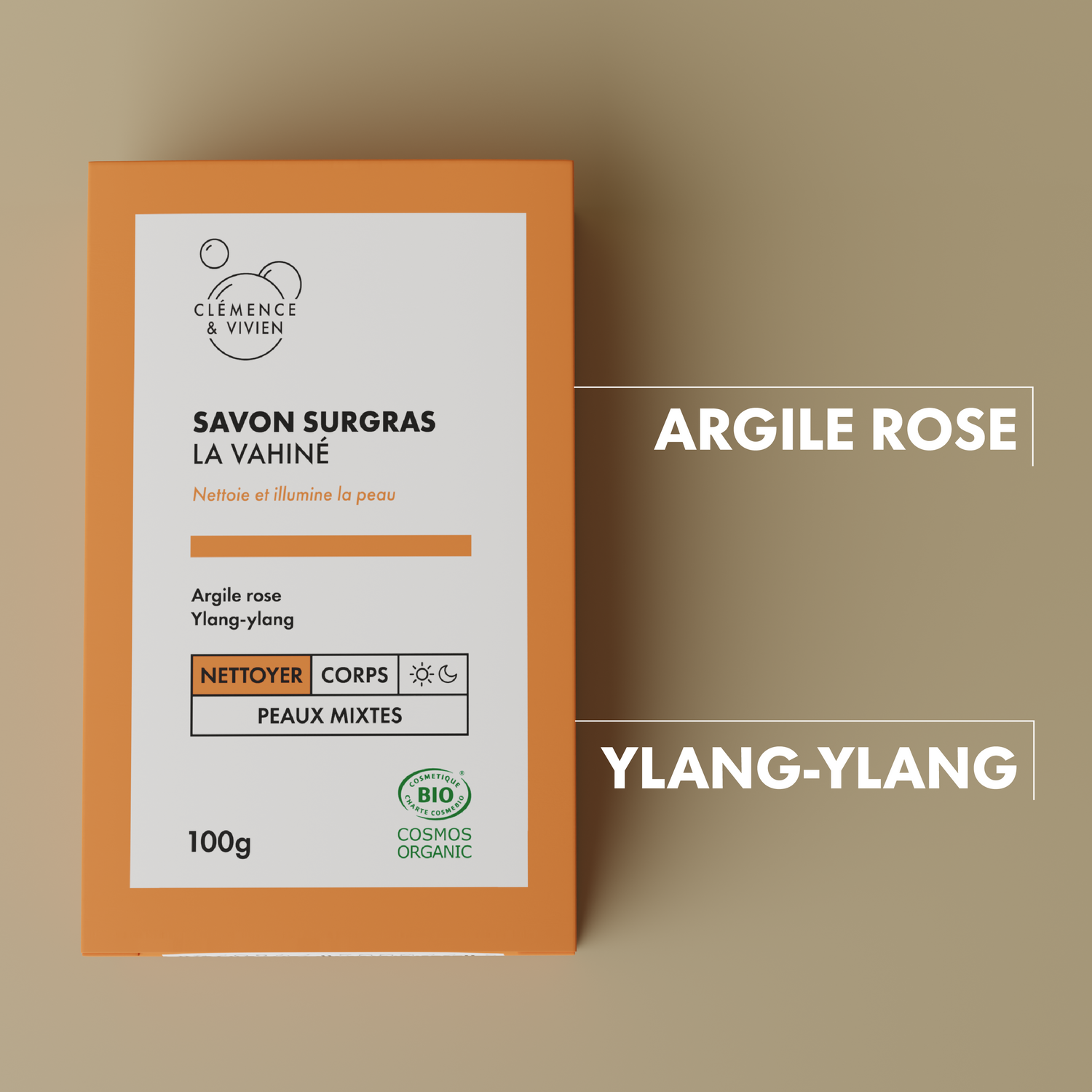 Ingrédients : Butyrospermum parkii butter*, Cocos nucifera oil*, Sodium hydroxyde, Aqua, Olea europaea fruit oil*, Helianthus annuus seed oil*, Ricinus communis seed oil*, Illite, Kaolin, Montmorillonite, Citrus aurantium dulcis peel oil, Cedrus atlantica wood oil, Cananga odorata flower oil, Limonene**, Linalool**, Benzyl benzoate**, Citronellol**, Benzyl salicylate**, Farnesol**. *issu de l’agriculture biologique / **naturellement présent dans les huiles essentielles.